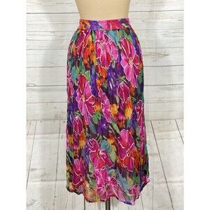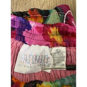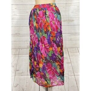 The product is a vintage 90s Passports floral embroidered chiffon boho maxi skirt in a size large. This feminine and romantic piece features a colorful multi-color design, perfect for adding a touch of whimsy to any outfit. Made from delicate chiffon material, this skirt exudes a bohemian vibe that is both trendy and timeless, ideal for women looking to make a statement with their fashion choices.