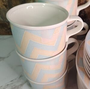 The set includes 8 dinner plates, 6 mugs, and 6 saucers/dessert or salad plates and adorned with a beautiful geometric pattern in beautiful pastel colors.