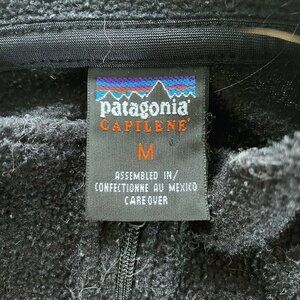 Patagonia Capilene woman's vintage black fleece 1/4 zip pullover jacket. It's made of 100% polyester and is a woman's size medium.