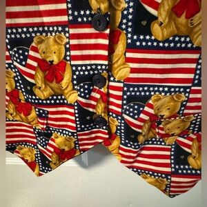 Vintage 90’s Patriotic Bear Flag Print Women's Tie Back Cotton Button Up Vest by JLN USA Large. Show your patriotic spirit with this vest featuring a charming bear print. The vibrant red, white, and blue colors make it a standout piece for any occasion.