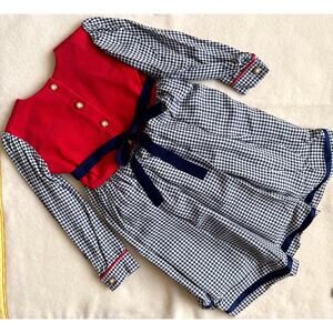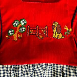 This dress is visually attractive and color theory matching, featuring a vibrant Red Corduroy bodice that contrasts sharply with the classic Gingham Check pattern on the sleeves and skirt. This bold juxtaposition is classic 90s style. The red bodice is enhanced with detailed Embroidered work showing a animal, a tree with gingham leaves, and a fence, creating a sweet Farm Scene. The skirt hem is finished with a navy ribbon accent, and the waist is cinched with a coordinating navy bow/sash, completing the charming, high-quality look.