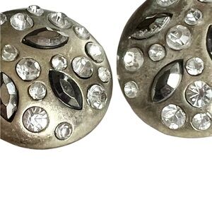 These vintage pierced earrings from the late 1990s to early Y2K era feature a bold round design adorned with clear and black faceted rhinestones arranged in an abstract, eye-catching pattern.