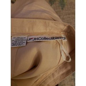 This pale pink suit by JH Collectibles is in good condition. The shoulder pads are stitched into the lining of the garment but if you wanted them out you could open and inner seam to remove them.
