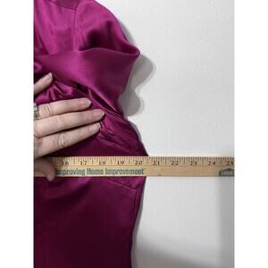 This vintage 90s pink silk shirt blouse by Jaclyn Smith is a glamorous piece suitable for a business occasion. Made from 100% silk in China, it features a metallic sheen and a gathered back detail for a touch of elegance. The shirt has short sleeves, a scoop neck, and a button-up front with a flattering gathered back design, offering a stylish and original look reminiscent of the 1900s. Perfect for those who love a glam rock style, this medium-sized shirt is a unique addition to any vintage clothing collection.