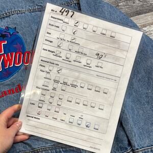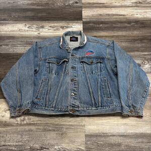 In excellent pre-owned condition mid wash blue colorway heavyweight, 100% cotton, long sleeve collared button up button cuffs front pockets, embroidered, casual classic vintage trucker bomber denim streetwear biker rider jean jacket.