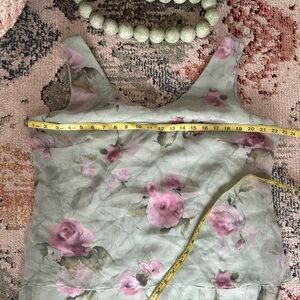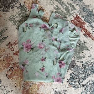 Light soft elegant green & pink floral print sleeveless dress with v-neck. Fabric has a crinkle texture