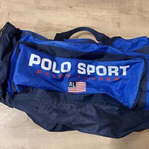 Vintage 90's Polo Sport Ralph Lauren Gym Duffle Bag Blue Black Flag Logo Straps Travel Zip Up