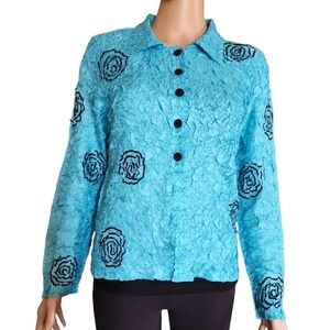 This is a fun, Y2K blouse in a bright blue color with black swirls and buttons. It's in good condition and the popcorn texture, while stretched quite a bit, still offers a lot of stretch. No stains, however it is missing the bottom 2 buttons. They would be an easy replace or honestly - it looks great as it is!