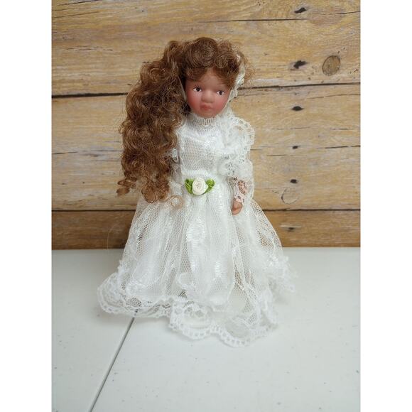 Vintage 90s Porcelain Doll White lace Dress Brown Curly Hair Tan 6 inches Tall