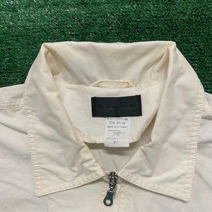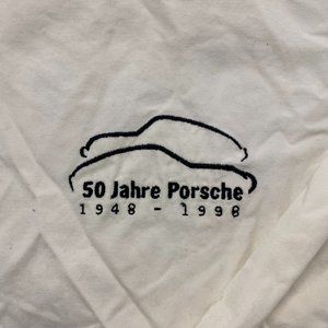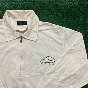 Cream off white long sleeve full zip windbreaker Harrington jacket by Porsche with black embroidered Jahre Porsche 50 Year Anniversary graphic. Baggy fit. Metallic YKK zipper. Elastic hem. Essential 1990s cars automotive outerwear.