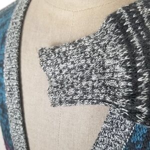 The perfect cozy sweater! Super cute purple, teal, grey and black vintage abstract print cardigan sweater with four front buttons, long arms and a slouchy, oversized fit. Perfect with some distressed mom jeans and a crop top!