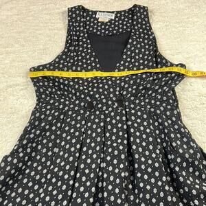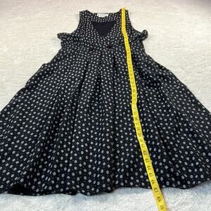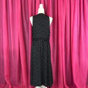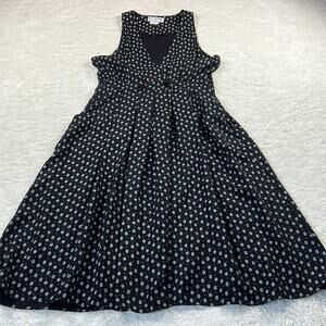 Longer midi length dress made in the USA. Features a white pattern over solid black, with button closure at fitted waist and plunging v neck. Scoop pockets in front, with smocking in back waist for a comfy fit.