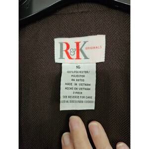 Vintage 90s R & K Originals Blazer Womens Brown Open Front Short Sleeve Size 16. Fake pockets. Shoulder Pads. No lining. Thick material. 100% Polyester. Excellent Condition.