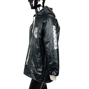 keywords: vintage, NFL, retro, football, sports, sporty, Los Angeles Raiders, Las Vegas Raiders, 90's, 2000's, Y2K, game day, raincoat, parka, puffer, rare, hard to find, gender neutral, unisex, hoodie, hooded, oversized, drawstring, pockets, zippers, zipper hood, collectible,