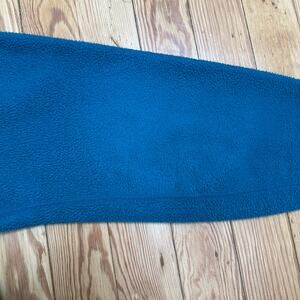 90s vintage teal fleece zip up sherpa jacket from REI, with a zippered chest pocket and side pockets, and an elastic waist.