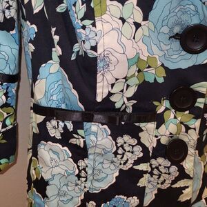 A stunning floral pattern in blue, black, white, and teal, this blazer is perfect for any occasion, whether it be a casual day out or a business meeting.
