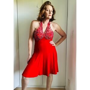Vintage 90s Red Fit & Flare Dress Size M L Sexy Halter Clubwear Party Dress USA