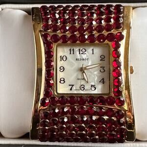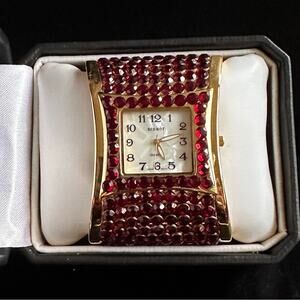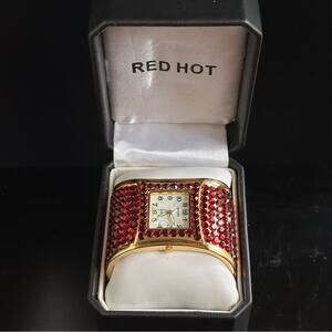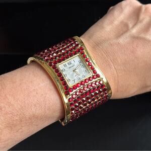 Vintage 90’s Red Hot Swarovski Crystal Wide Band Bracelet Watch