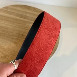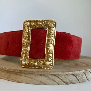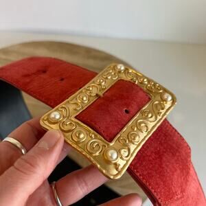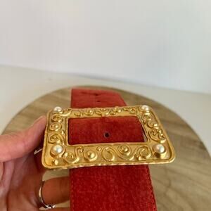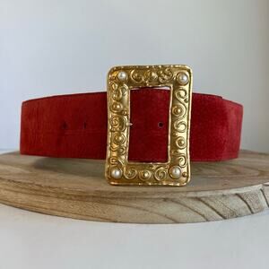 Vintage 90s Red Suede Genuine Leather Wide Pearl & Gold Buckle Belt Size Small