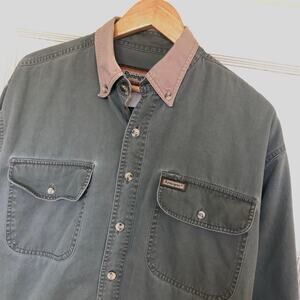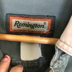 Keywords: hunting, duck, clay shoot, sportsman, workwear, chore, utility, button front, long sleeve, range shirt, Remington Arms, vintage menswear, olive green, two tone, outdoors, streetwear, 1990s
