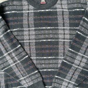 Stay warm and stylish with this classic gray plaid sweater. Perfect for any occasion.