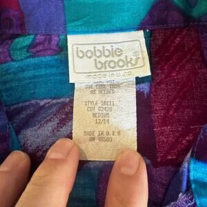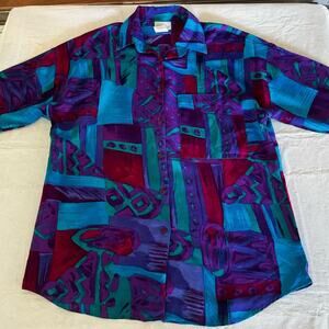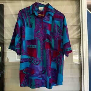 Vintage 90s Retro Purple Green Abstract Blouse Size Medium Buttons Bobbie Brooks