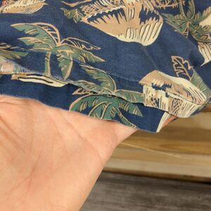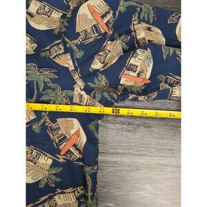 Vintage 1990s Joe Kealoha's Reyn Spooner Hawaiian button down shirt. Tiki hut pattern all over. No stains or tears HOWEVER 2ND BUTTON FROM BOTTOM HEM IS MISSING and bottom hem is pretty worn-see photos.