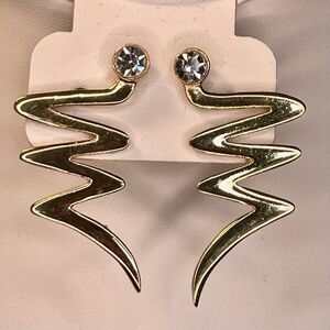 Vintage 90s Rhinestone Zig Zag Earrings Gold Tone Metal Shinny Swoosh