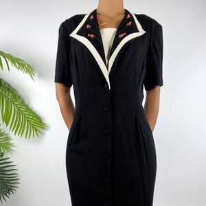 Features collar, short sleeves, button closure, and flower embroidery. This is a beautiful vintage piece that is so flattering! It fits great and is excellent quality. Dress is pinned on size 0-4 model.
