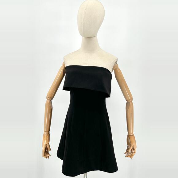 Designed in a strapless silhouette, this fully lined black mini dress features a structured bodice that stays in place and a clean, flared skirt for a sleek evening look.