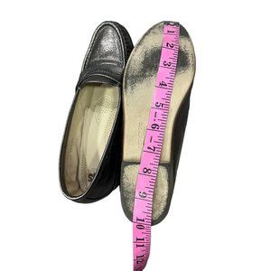 These loafers are in gently used pre-owned vintage condition. They feature a soft metallic leather upper. Stored in original box.