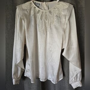 Vintage 90’s San Andre Satin Ivory Blouse Victorian Woven Lace Trim Collar Sz 6
