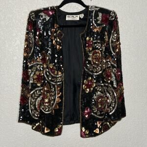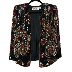 The product is a vintage 90's Scala sequined beaded silk jacket in black, gold, bronze, silver, and pink colors. This mid-length jacket is designed for women in a petite size (PM) and features a glam, designer, and luxe style with a touch of old money aesthetic. The exterior of the jacket is adorned with sequins, adding a touch of glittery sparkle to the overall look. Made from 100% silk, this jacket is a chic and stylish addition to any woman's wardrobe.