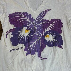 Vintage Hawaiian purple orchid USA made V neck white T-shirt