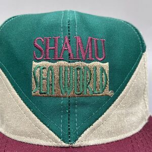 Vintage 1990s SeaWorld Shamu snapback hat featuring a tri-color panel design in green, tan, and burgundy. Embroidered Shamu SeaWorld logo on the front and SW diamond logo on the back. Made in Taiwan R.O.C. with original SeaWorld tag still attached. Light wear consistent with age, but clean. See photos for condition details.
