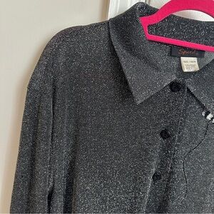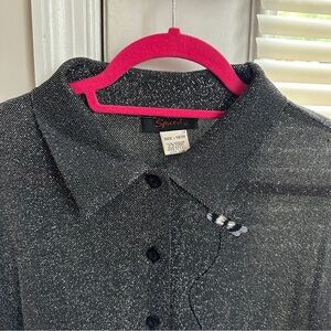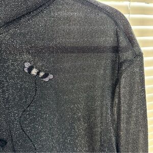 Vintage 90s Spiced semi-sheer black-silver glittery metallic button down blouse with an embroidered dragonfly on the upper left chest. Long sleeve, collared neckline, button cuffs. Acetate/lurex blend.