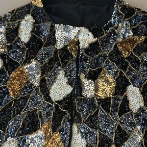 Vintage 90’s sequin silk jacket with hand sewn gold, silver & white sequins in the shape of falling leaves. Features cropped shape, 3/4 raglan sleeve, silk lining, hook & eye front closure and round neckline.