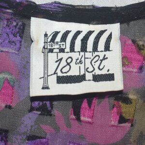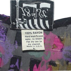 Really cute vintage top! Sheer with a bit of shimmer. Floral print. Ruffles in front and back. Cropped length. Long sleeves. Size L. Measures 38 bust. Length varies slightly, approx. 17.5-18 inches. Some discolor to label. Slight shorter ruffle in back. See photos. Necklace is not included.