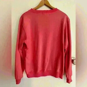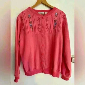 Women’s pink vintage button up pink sweatshirt with floral embroidery across the chest. It is in excellent condition with little signs of wear. Made of 60% cotton and 40% polyester.