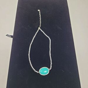 Lucoral Company vintage silver necklace from the 90s, featuring a faux turquoise pendant. This unique piece is signed by LUC and includes rhinestone adorned bicone beads. Perfect for adding a touch of glamour to your tribal or island vacation ensemble.