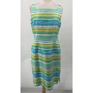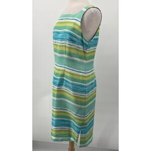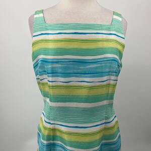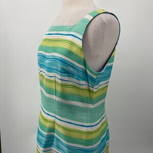 Keywords: abstract stripes coastal vacation travel sundress lightweight versatile pastel classic chic colorful breathable natural fiber slinky silky summer summery spring tank dress shift dress fit and flare thick straps teal turquoise lime green yellow designer luxe high quality well made knee length vtg retro 1990s nineties 1980s eighties 80s y2k 00s 2000s resort resortwear cruise tropical prep preppy church modest high neckline dainty demure femme feminine sophisticated