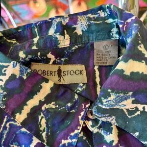 Fun vintage silk button down shirt featuring an all over pattern. It has a singular pocket and buttons to the top. In excellent condition!