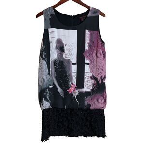 Vintage 90's Simon Chang Art to Wear Mini Drop Waist Blouson Dress Size 8 Black Pink