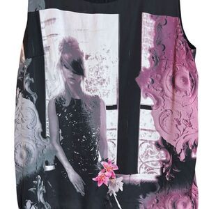 bodice has a silky graphic of a woman in a black dress sitting near a window