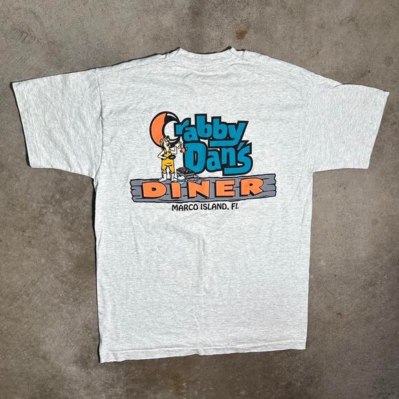 Vintage 90s Single Stitch Crabby Dans Diner Biker Tee Gray Orange Blue Front and Back Graphic Shirt