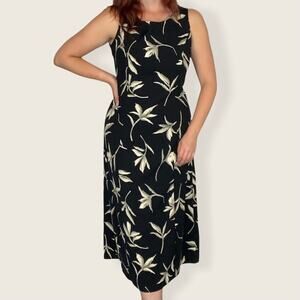 The dress is a neutral black & ivory in color, fit and flare style, features a tropical floral print pattern, fits as a maxi or midi length dress depending on height, zips up the back, sleeveless 90s sundress/dress.