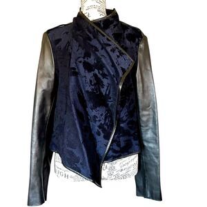 Vintage 90s Size S Black Leather Floral Embroidered Velvet Open Front Jacket