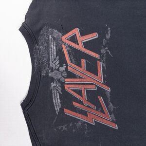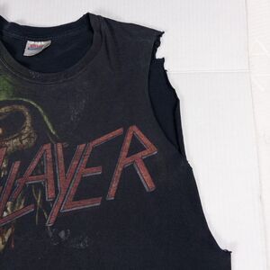 Original Slayer skull graphic tee on a Hanes Heavyweight blank, cut into a sleeveless muscle style with a perfectly worn faded black wash. Features a huge front skull print with classic Slayer logo and back hit, double sided graphics, and that soft broken in cotton everyone wants from true vintage band shirts. Tagged XL and fits like an oversized cutoff tee ideal for layering over a long sleeve or wearing on its own. See pics for measurements and condition details.