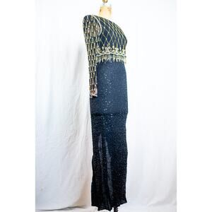 Vintage 90s Laurence Kazar Black Gold Silk Beaded Maxi Formal Evening Gown Dress, Sequins Beading, Elegant Party Cocktail, XS