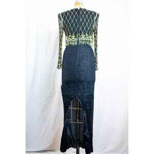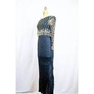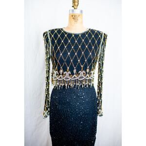 1990s Black heavily beaded maxi dress by Laurence Kazar. This dress features a silk fabric body with black, gold, and white sequins and beading, an empire waist with beading dangling from the bodice, sheer long sleeves, and a zipper down the back. The dress has a slip up the back of the skirt. This dress has been cleaned and is ready to wear. There are a few tiny missing beads here and there, but nothing major.